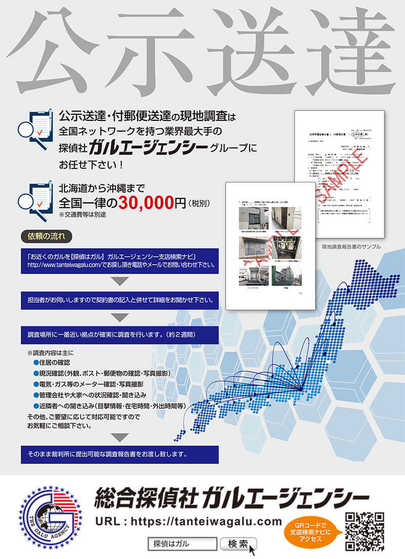 ガルエージェンシーでは士業様に向けた公示送達や付郵便送達に必要となる現地調査サービスを全国統一の33,000円(税込み)でご案内しております。